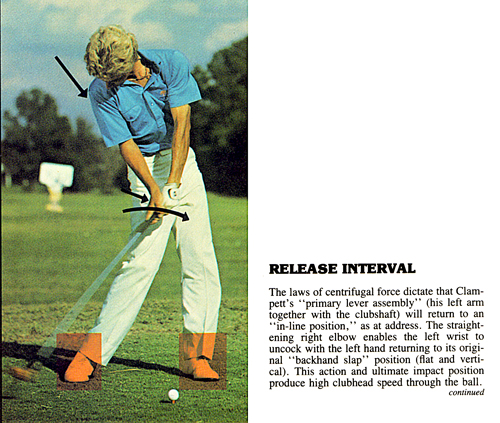 Release Interval. The primary lever assembly (the left arm plus the clubshaft) is racing toward full extension where its full radius will produce a high clubhead speed (surface speed). The straightening right elbow is allowing the left wrist to uncock and is returning the left hand to its original "backhand slap" position (flat and vertical) imparting its swinging door motion and translating the lever extension velocity into a forward motion through the ball. The ideal #3 accumulator (the angle formed by the left arm and the clubshaft) application shown here is the true high velocity clubhead motion overtaking the left arm and is true rhythm, entirely different from and independent of pace.