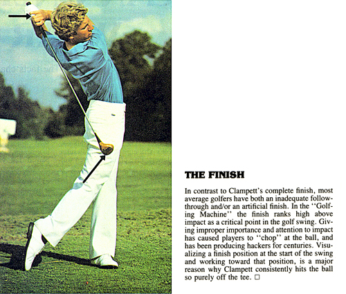 The Finish. Bobby's complete finish immediately removes him from a hacker classification by every beholder. Why? Hackers have both an inadequate follow-through and an artificial finish. The finish has the rank of a station in the Star System Triad for simplified golfing but impact does not. Endowing impact with improper importance and attention has caused players to "chop" at the ball and has been producing hackers for centuries. This finish is therefore a major contribution to Bobby's yardage and to the elevation of his procedures to a sought after model. After the follow-through, this is the second great step out of Hackerville.