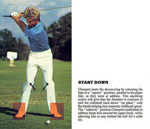 Start Down. It is recommended that the hip turn be preceded by a hip slide parallel to the plane line so body power (the coiled left side) then can pull the butt of the clubshaft and the right shoulder toward the plane line before the pivot can turn itself too far inside the plane line and have to stretch unnecessarily to reach the ball. This also disrupts the pivot component release sequence necessary for this swinging procedure of longitudinal acceleration of the clubhead which duplicates the process of pulling an arrow from a quiver which motion is to be maintained until the release swiches ends with adjustable rapidity. The knees passing through the sit down position maintains the left side assignment of turning the body to generate centrifugal force. Power package muscle power (right triceps thrust) can make a miniscule contribution and only with great effort during a swing procedure.
